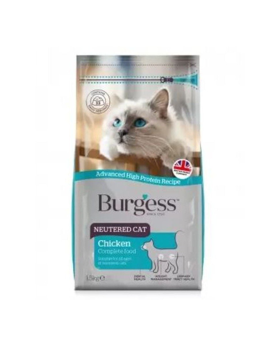 Burgess neutered cat chicken complete food for all ages 1.5 kg Why a Neutered cat food? While neutering has many positive benefits, it does mean that your kitten or cat’s needs can change. Neutered cats can be more at risk of developing urinary tract infections. They are also more likely to stay closer to home or spend more time in their home. This means they have a higher chance of weight gain and hairballs. A specialised diet helps to support all of these additional needs. Why Burgess Neutered cat? Our advanced high protein recipe contains the essential nutrients and vitamins that your neutered cat needs to help them stay healthy and content. We recommend your neutered cat should be fed an adapted diet: High in tasty and digestible meat protein to help maintain lean muscle mass *Added L-Carnitine to help maintain a healthy weight Formulated to support a healthy urinary system We use a specialist ingredient to help teeth and gum health The fibre in our recipe helps to prevent hairballs Added yucca extract helps to reduce litter tray odours and helps with stool formation Introduce Burgess Neutered Cat to your cat by gradually mixing in the new food with the old over a period of 7-10 days until the new food completely replaces the old diet Always ensure you are monitoring your cats weight to ensure a healthy weight. You should take treats into account when working out daily feeding requirements. Always ensure fresh clean water is available for your cat. Analytical ConstituentsCrude Protein 37.9%, Crude Fat 10.0%, Crude Ash 9%, Crude Fibre 3.35%, Calcium 1.4%, Phosphorus 1.2%. CompositionPoultry 56% (Poultry meal 41% (min 26% Chicken), hydrolysed poultry powder 5%, turkey meal 4%, poultry fat 3%, chicken digest 2.5%), Rice, Wheat, Cellulose (4%), Brewer’s Yeast (2.5%), Fish Meal, Dried Egg, Dried Cranberry (0.5%), Minerals, Fructooligosaccharides (0.3%), Extract of Yucca Schidigera (0.05%)