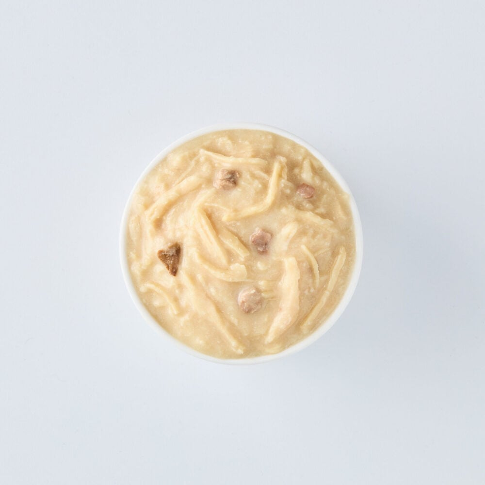 المكونات: لحم دجاج، أحشاء دجاج (قوانص، كبد، قلوب)، مرق دجاج، نشا تابيوكا معدل، صمغ زانثان، فيتامينات، معادن، زيت جوز الهند (MCT)، زيت دوار الشمس، فركتوليغوساكاريد، تورين، زيت الكريل.