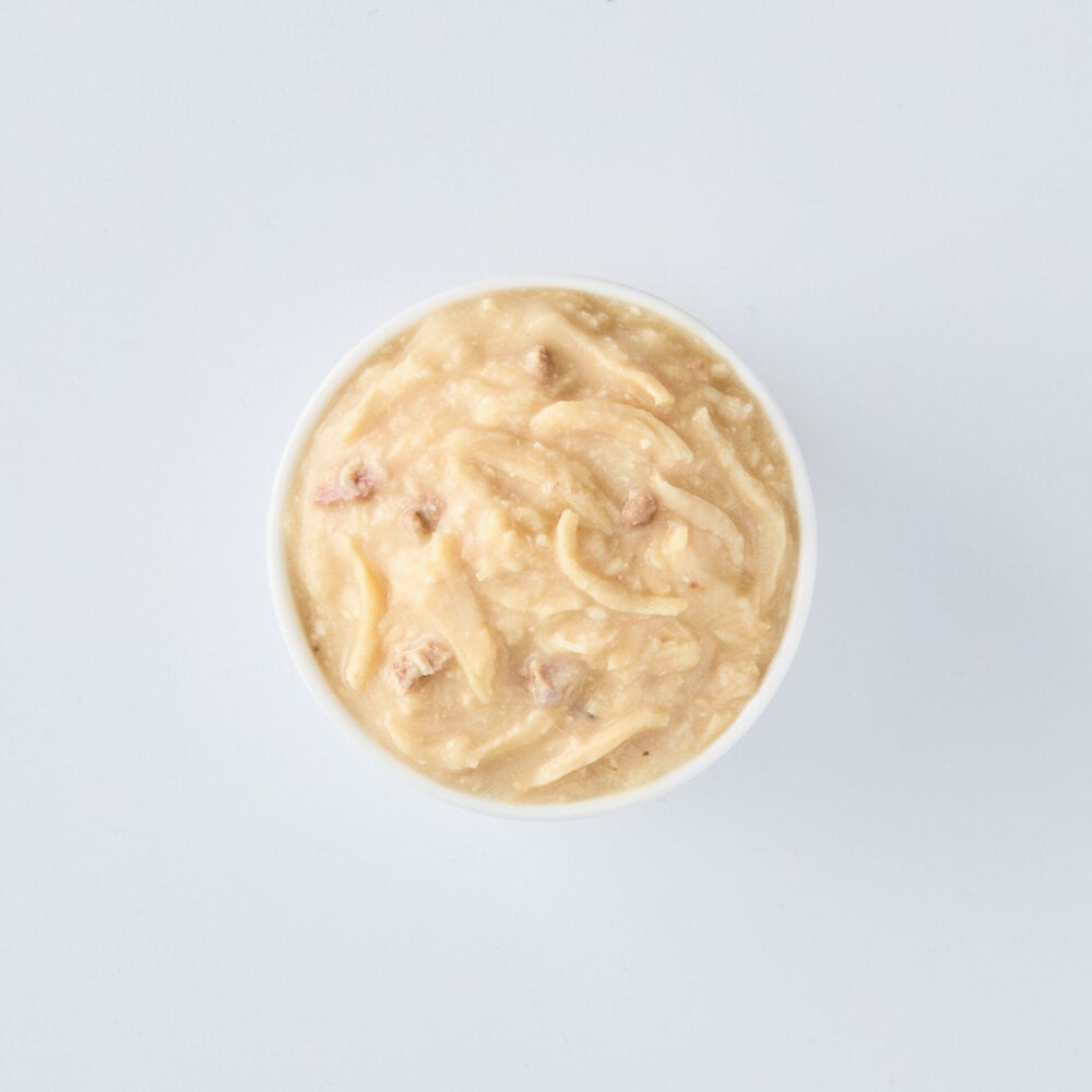 المكونات: لحم دجاج، أحشاء دجاج (قوانص، كبد، قلوب)، مرق دجاج، تونة، نشا تابيوكا معدل، صمغ زانثان، فيتامينات، معادن، زيت جوز الهند (MCT)، زيت دوار الشمس، فركتوليغوساكاريد، تورين، زيت الكريل.