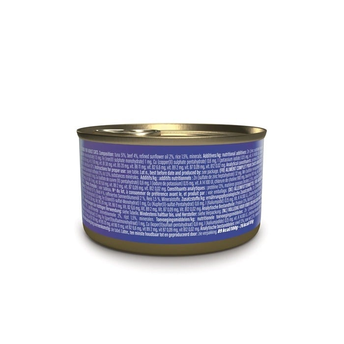 المكونات: تونة 51٪، شرائح لحم بقري 4٪، أرز 1.5٪، زيت دوار الشمس المكرر 2٪، معادن.القيمة الغذائية:• بروتين: 13٪• دهون خام: 2.5٪• ألياف خام: 0.5٪• رماد خام: 1٪• رطوبة: 82٪